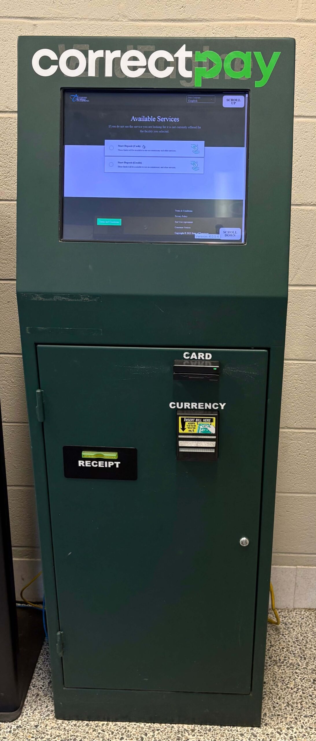 The Monroe County Sheriff’s Office offers family and friends a convenient way to setup and add funds to an inmate Commissary Account at our CorrectPay kiosk, located on the far-left side of the Justice Center Building entrance at: